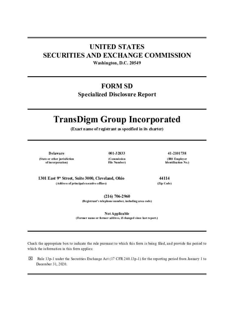 UNITED STATES SECURITIES AND EXCHANGE COMMISSION Washington, D.C. 20549FORM SD Specialized Disclosure ReportTransDigm Group Incorporated (Exact name of registrant as specified in its charter)Delaware00132833412101738(State