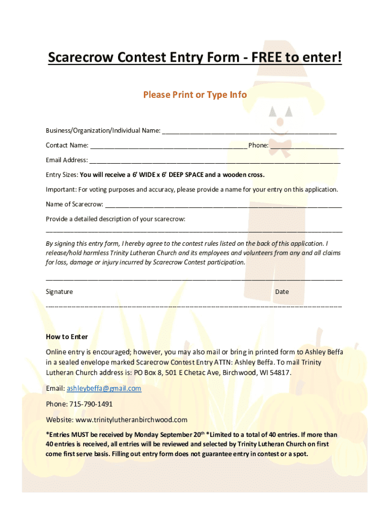 Scarecrow Contest Entry Form FREE to enter! Please Print or Type InfoBusiness/Organization/Individual Name: Contact Name: Phone: Email Address: Entry Sizes: You will receive a 6 WIDE x 6 DEEP SPACE
