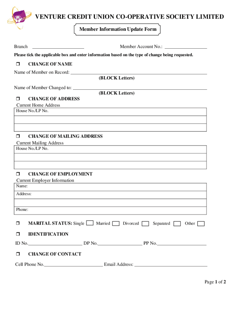 VENTURE CREDIT UNION COOPERATIVE SOCIETY LIMITED Member Information Update Form Branch Member Account No.: Please tick the applicable box and enter information based on the type of change being requested.
