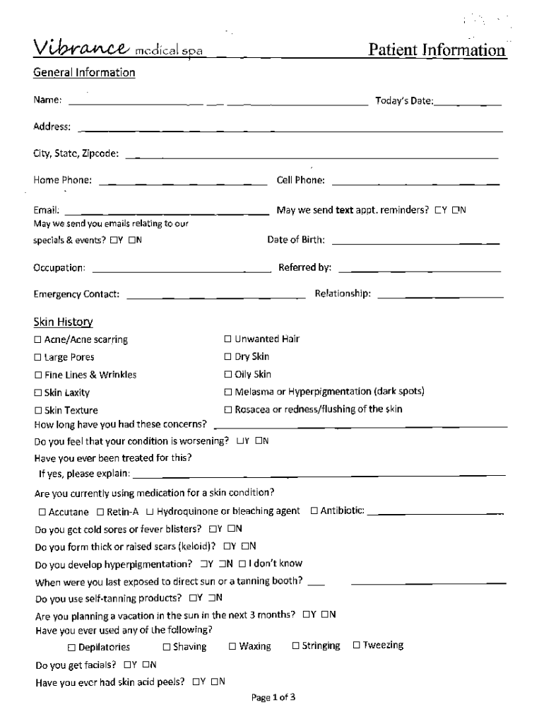 Patient InformationGeneral InformationToday's Date: Name: Address:City, State, Zip code:Home Phone:Cell Phone:Email: May we send text apt. Reminders? OF, ON May we send you emails relating to update