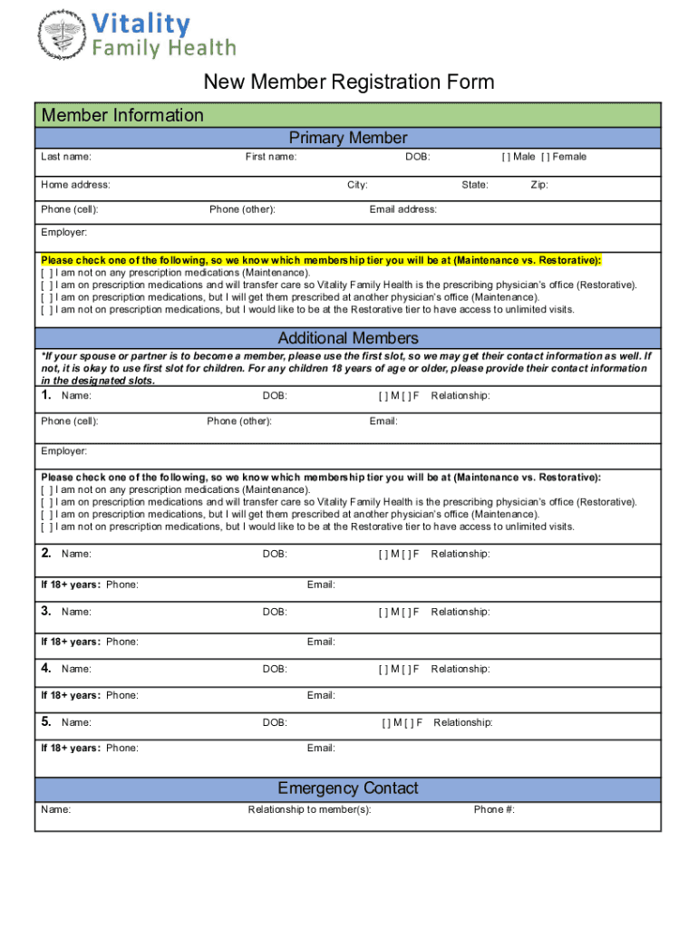 New Member Registration Form Member Information Primary Member Last name:First name:DOB:Home address: Phone (cell): Male Felicity: Phone (other):State:Zip:Email address:Employer: Please check one