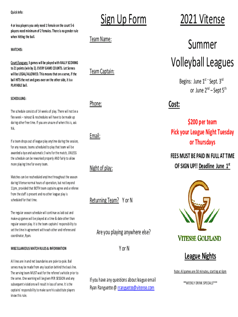 Quick Info: 4 or fewer players you only need 1 female on the court 56 players need minimum of 2 females. There is no gender rule when hitting the ball. Sign Up Form Team Name:Summer Volleyball LeaguesMATCHES:
