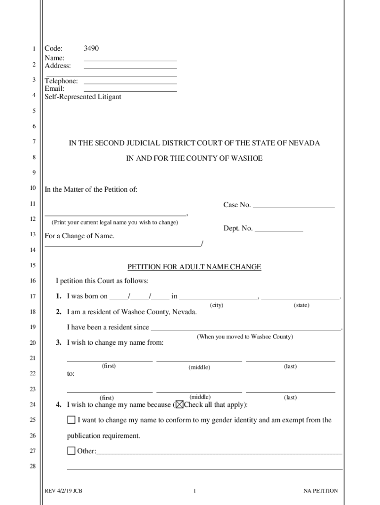 1 2 3 4Code: 3490 Name: Address: Telephone: Email: SelfRepresented Litigant5 6 7IN THE SECOND JUDICIAL DISTRICT COURT OF THE STATE OF NEVADA8IN AND FOR THE COUNTY OF WASHOE9 10In the Matter of the