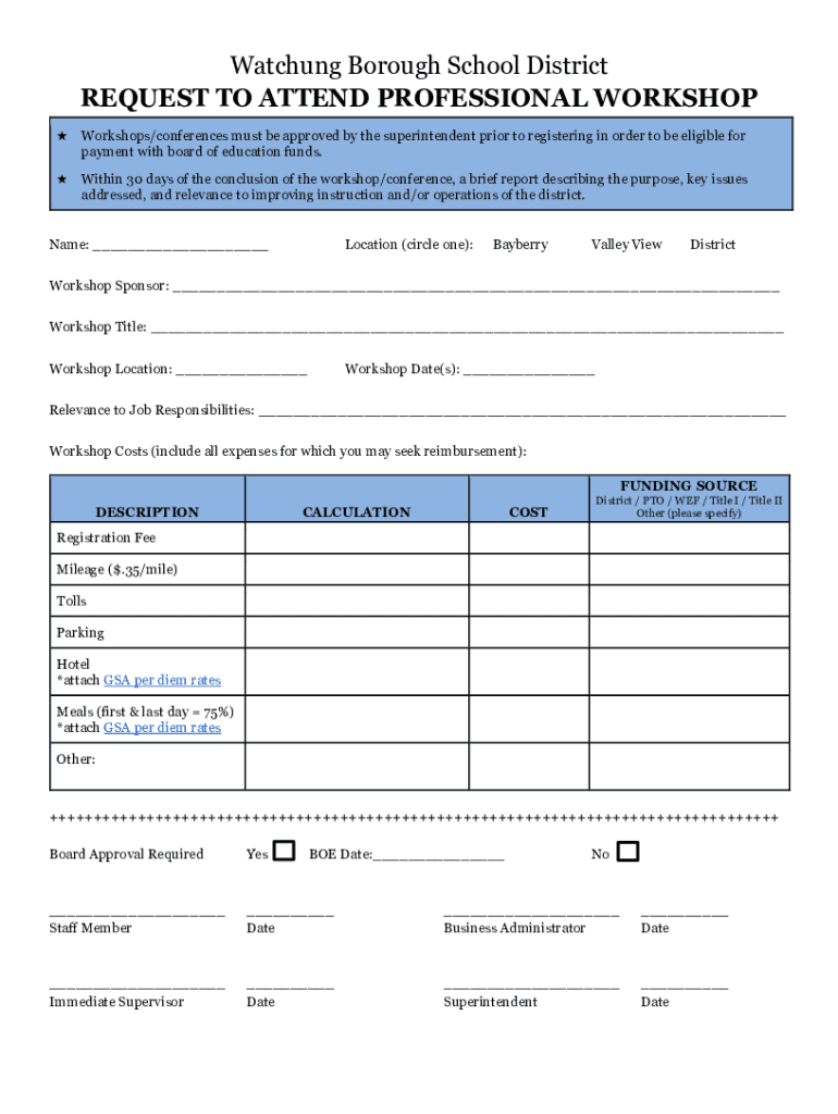 Watching Borough School District REQUEST TO ATTEND PROFESSIONAL WORKSHOP Workshops/conferences must be approved by the superintendent prior to registering in order to be eligible for payment with