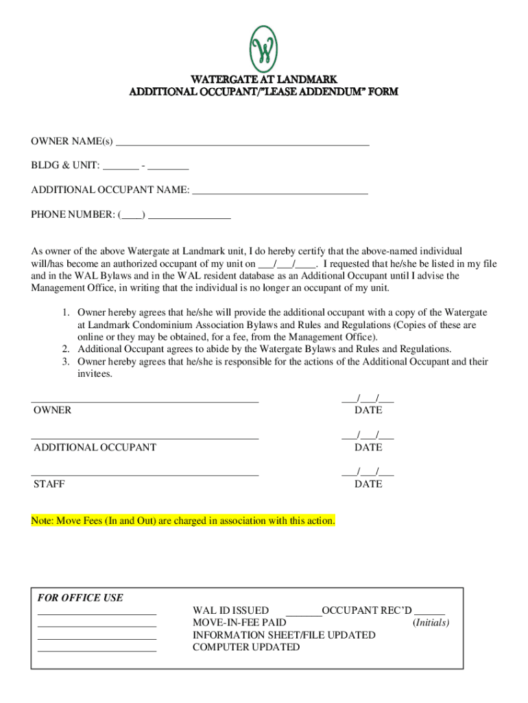 WATERGATE AT LANDMARK ADDITIONAL OCCUPANT/LEASE ADDENDUM FORMER NAME(s) BLDG & UNIT: ADDITIONAL OCCUPANT NAME: PHONE NUMBER: () As owner of the above Watergate at Landmark unit, I do hereby certify