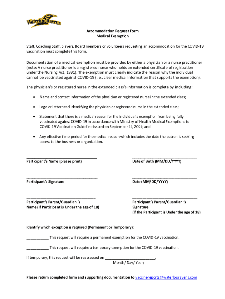 Accommodation Request Form Medical Exemption Staff, Coaching Staff, players, Board members or volunteers requesting accommodation for the COVID-19 vaccination must complete this form. Documentation