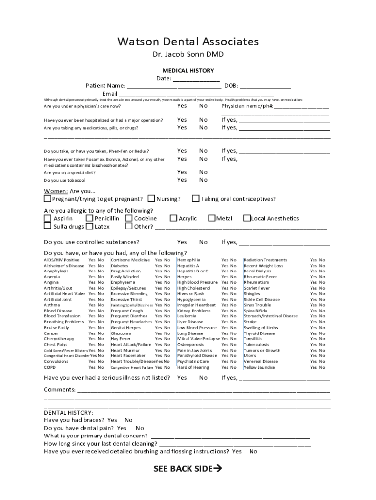 Watson Dental Associates Dr. Jacob Son DMD MEDICAL HISTORY Date: Patient Name: DOB: Email Although dental personnel primarily treat the area in and around your mouth, your mouth is a part of your