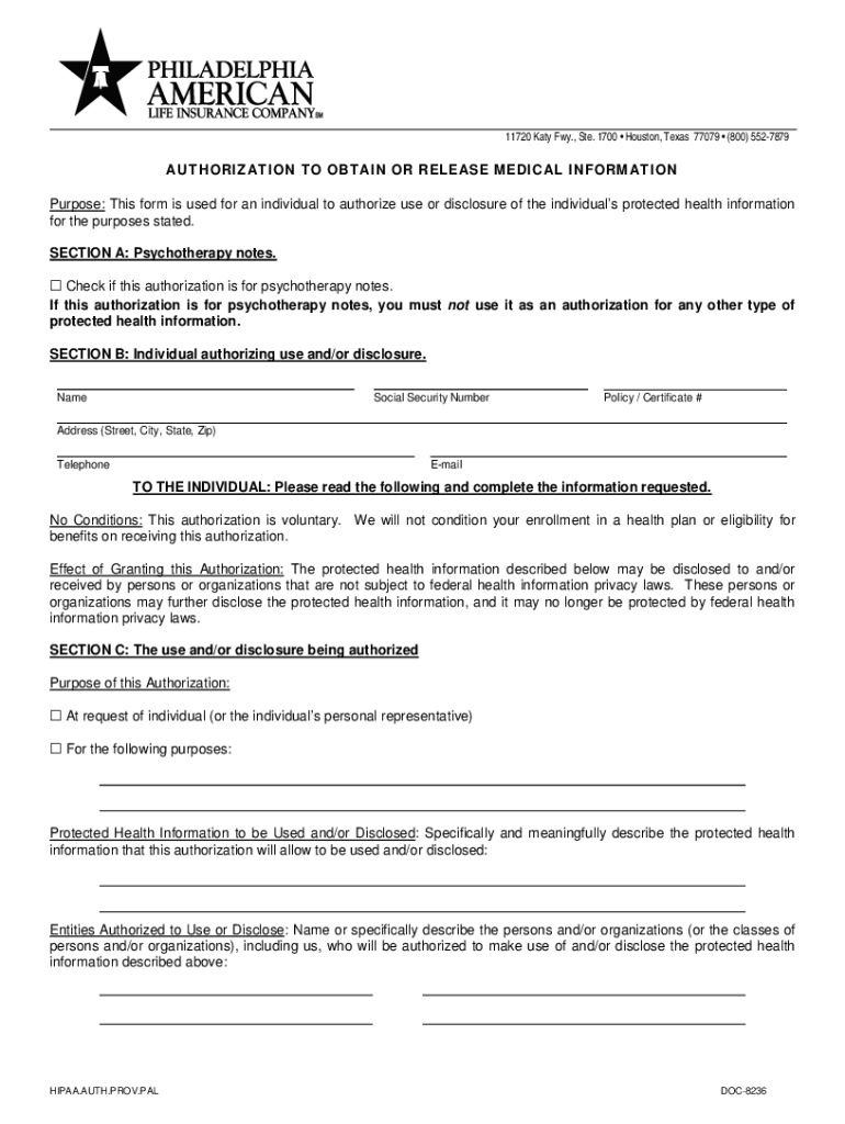 11720 Katy Fwy., Ste. 1700 Houston, Texas 77079 (800) 5527879AUTHORIZATION TO OBTAIN OR RELEASE MEDICAL INFORMATION Purpose: This form is used for an individual to authorize use or disclosure of the