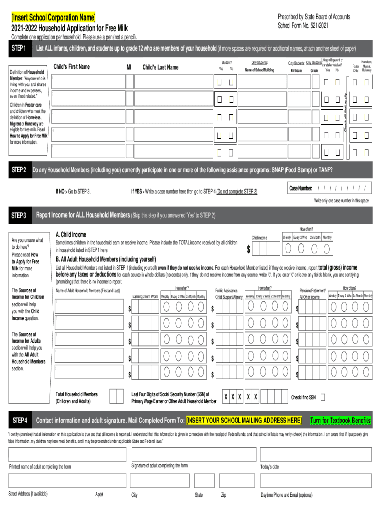 Insert School Corporation Name 20212022 Household Application for Free MilkPrescribed by State Board of Accounts School Form No. 521/2021Complete one application per household. Please use a pen (not