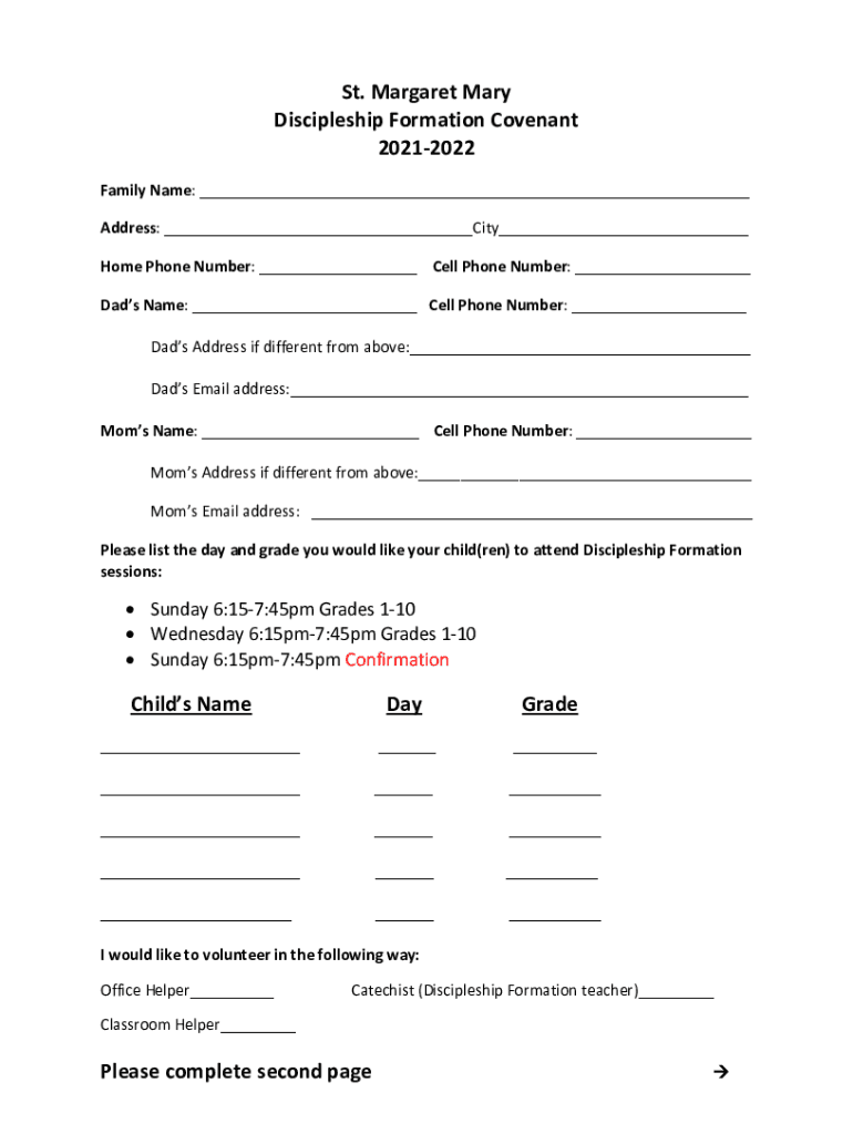 St. Margaret Mary Discipleship Formation Covenant 20212022 Family Name: Address: City Home Phone Number: Cell Phone Number: Dads Name: Cell Phone Number: Dads Address if different from above: Dads