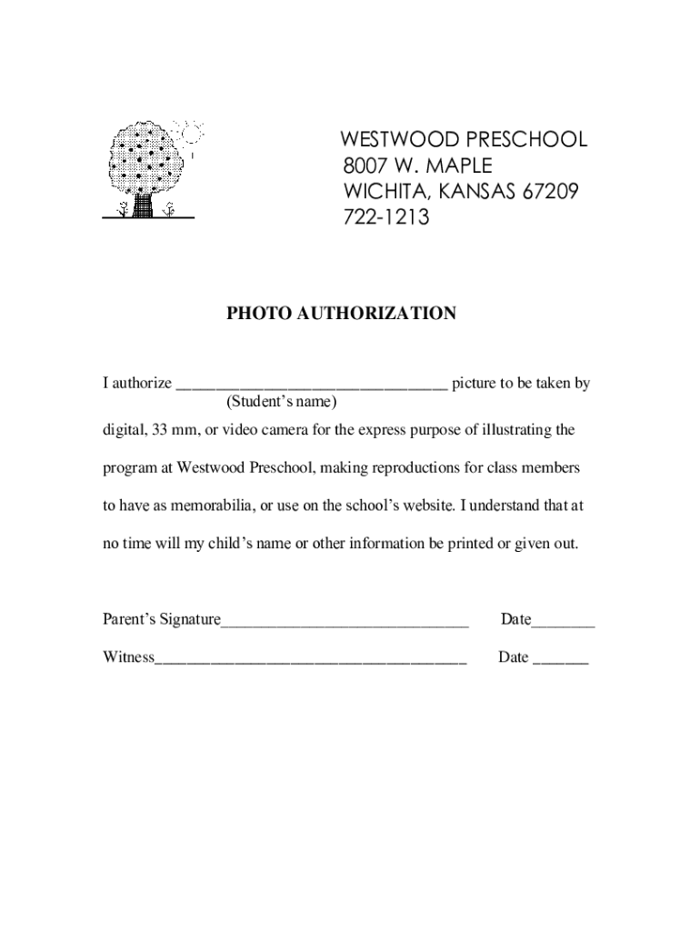 WESTWOOD PRESCHOOL 8007 W. MAPLE WICHITA, KANSAS 67209 7221213PHOTO AUTHORIZATION authorize picture to be taken by (Students name) digital, 33 mm, or video camera for the express purpose of illustrating