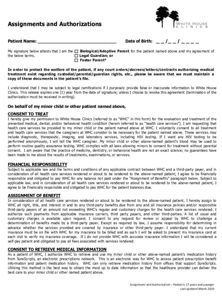 Assignments and Authorizations Patient Name: My signature below attests that I am the below terms. Date of Birth: / / Biological/Adoptive Parent for the patient named above and my agreement of Legal