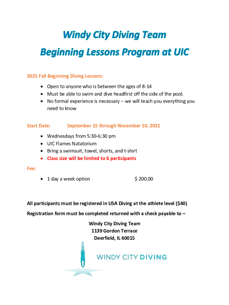 2021 Fall Beginning Diving Lessons: Open to anyone who is between the ages of 814 Must be able to swim and dive headfirst off the side of the pool. No formal experience is necessary we will teach