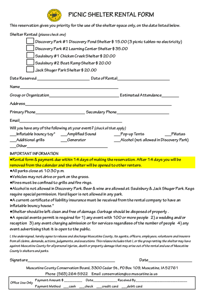 PICNIC SHELTER RENTAL FORM This reservation gives you priority for the use of the shelter space only, on the date listed below. Shelter Rented (please check one) Discovery Park #1 Discovery Pond Shelter