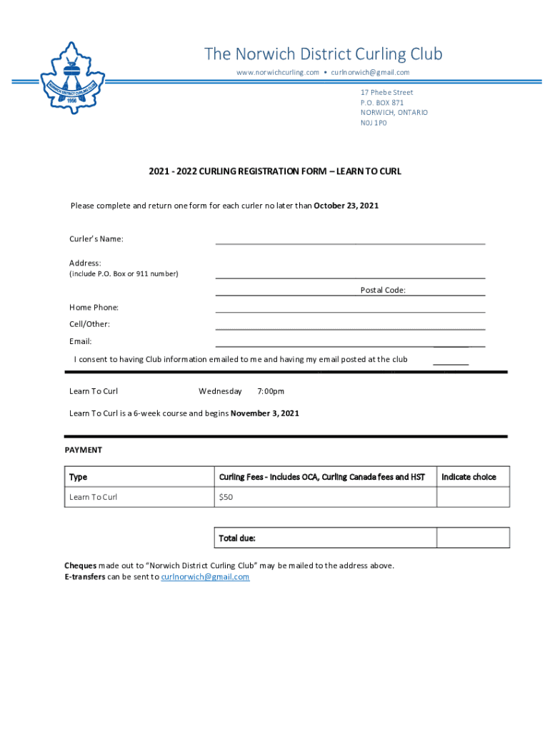 The Norwich District Curling Club www.norwichcurling.com curlnorwich@gmail.com 17 Phoebe Street P.O. BOX 871 NORWICH, ONTARIO N0J 1P02021 2022 CURLING REGISTRATION FORM LEARN TO CURL Please complete