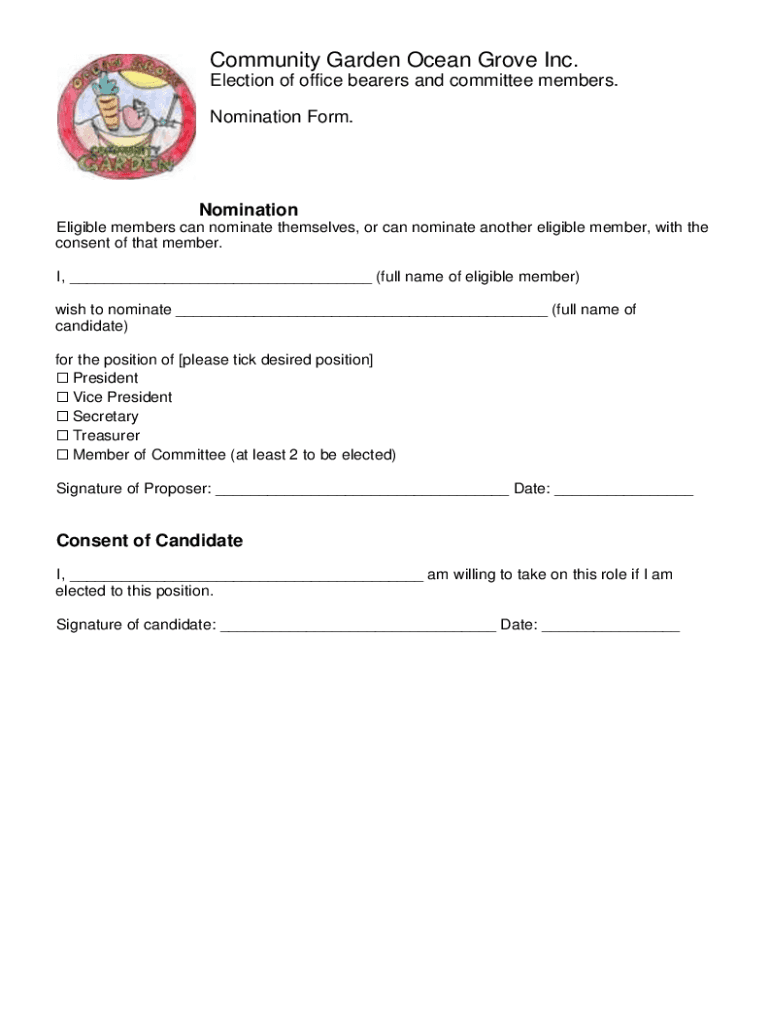 Community Garden Ocean Grove Inc. Election of office bearers and committee members. Nomination Form. Nomination Eligible members can nominate themselves, or can nominate another eligible member, with