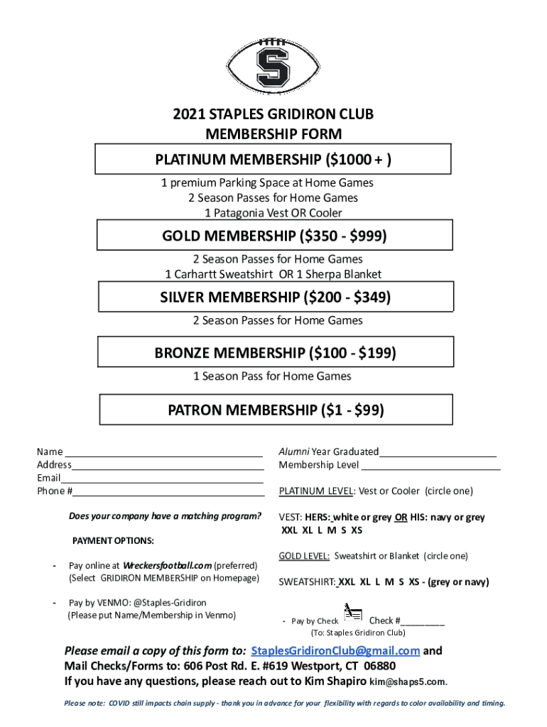 2021 STAPLES GRIDIRON CLUB MEMBERSHIP FORM PLATINUM MEMBERSHIP ($1000 +) 1 premium Parking Space at Home Games 2 Season Passes for Home Games 1 Patagonia Vest OR CoolerGOLD MEMBERSHIP ($$350999) 2