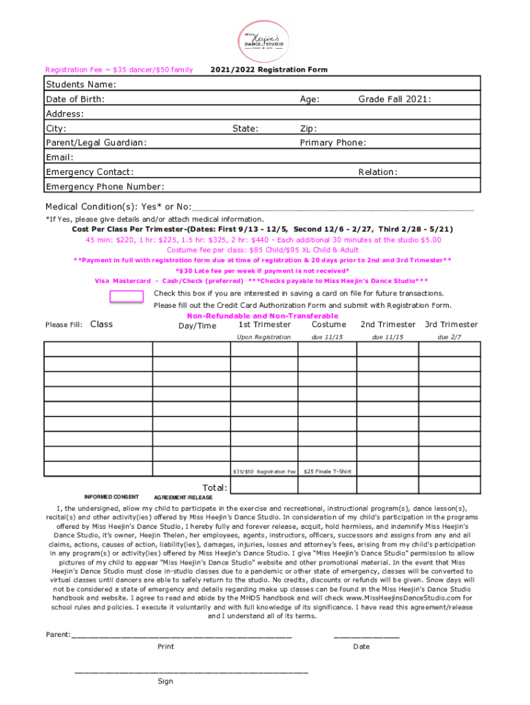 Registration Fee $35 dancer/$50 family2021/2022 Registration FormStudents Name: Date of Birth:Age:Grade Fall 2021:Address: City:State:Parent/Legal Guardian:Zip: Primary Phone:Email: Emergency Contact:Relation:Emergency