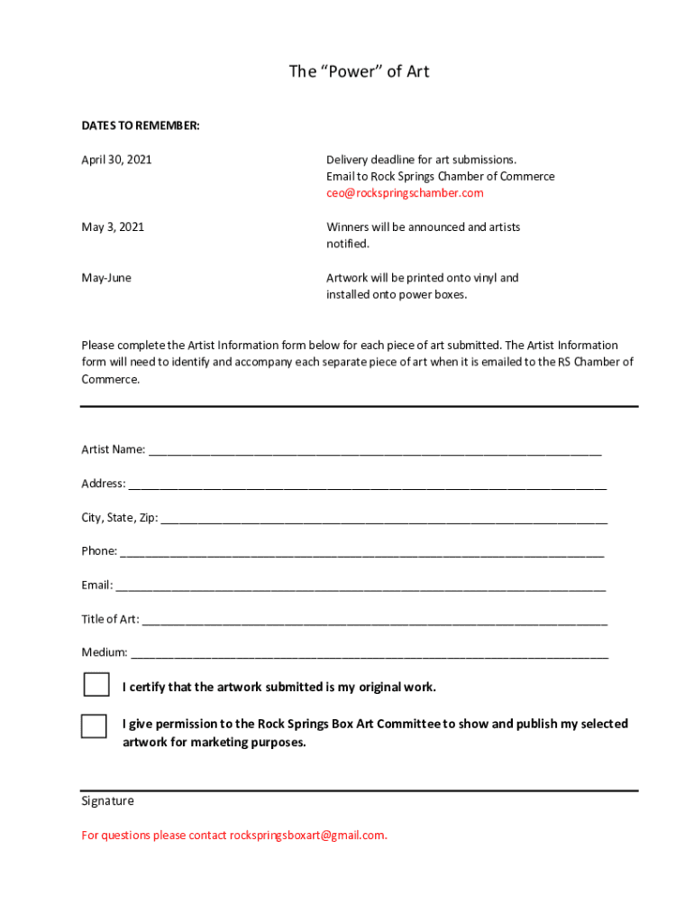 The Power of Art DATES TO REMEMBER: April 30, 2021Delivery deadline for art submissions. Email to Rock Springs Chamber of Commerce ceo@rockspringschamber.comMay 3, 2021Winners will be announced and