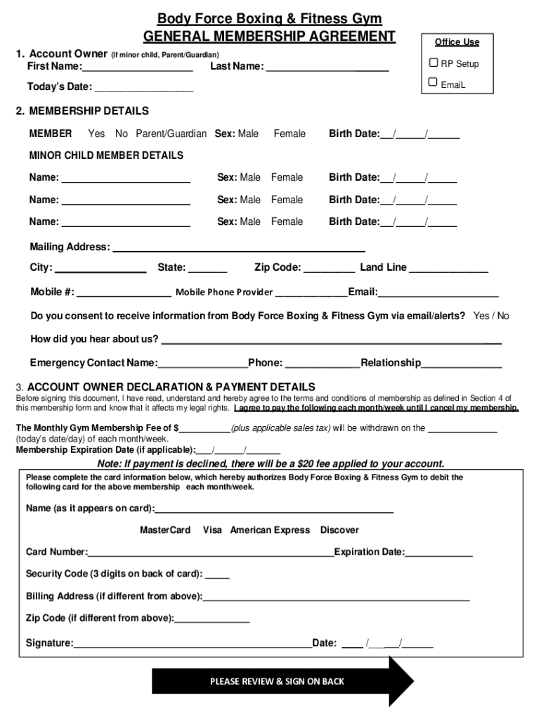 Body Force Boxing & Fitness Gym GENERAL MEMBERSHIP AGREEMENT 1. Account Owner First Name:Office Use(if minor child, Parent/Guardian)Last Name:RP Setup EmaiLTodays Date: 2. MEMBERSHIP DETAILS MEMBERYesNo