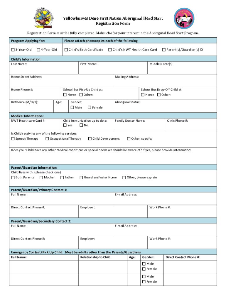 Yellow knives Done First Nation Aboriginal Head Start Registration Form must be fully completed. Mahdi CHO for your interest in the Aboriginal Head Start Program. Program Applying for: 3YearOldPlease