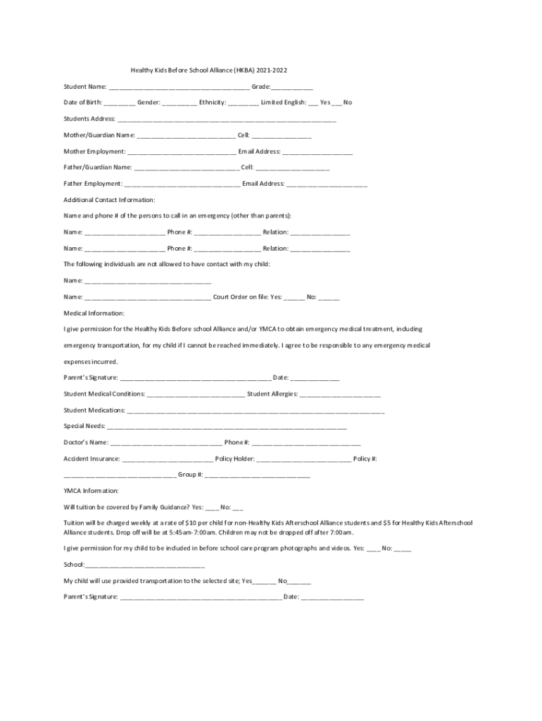 Healthy Kids Before School Alliance (HBA) 20212022 Student Name: Grade: Date of Birth: Gender: Ethnicity: Limited English: Yes No Students Address: Mother/Guardian Name: Cell: Mother Employment: Email