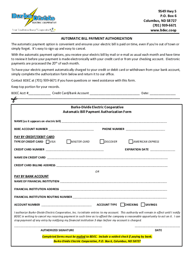 9549Hwy5 P.O. Box6 Columbus,ND58727 (701)9396671 www.bdec.coopAUTOMATICBILLPAYMENTAUTHORIZATION Theautomaticpaymentoptionisconvenientandensuresyourelectricbillispaidontime, evenifyou\'reoutoftownor