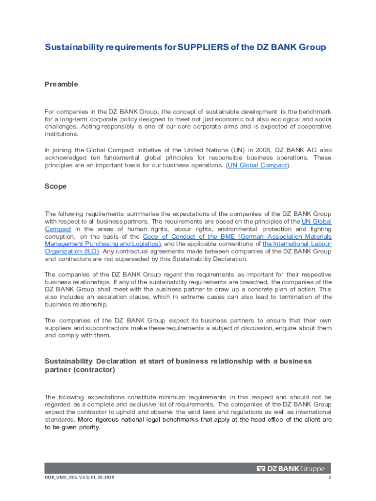 Sustainability requirements for SUPPLIERS of the DZ BANK GroupPreambleFor companies in the DZ BANK Group, the concept of sustainable development is the benchmark for a long term corporate policy designed
