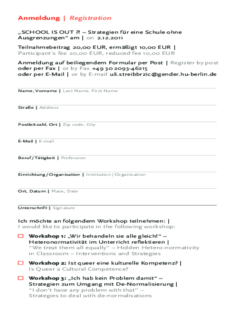 Amending Registration SCHOOL IS OUT ?! Strategies for and Schulz one Ausgrenzungen am on 2.12.2011 Teilnahmebeitrag 20,00 EUR, permit 10,00 EUR Participants fee 20,00 EUR, reduced fee 10,00 EUR Amending