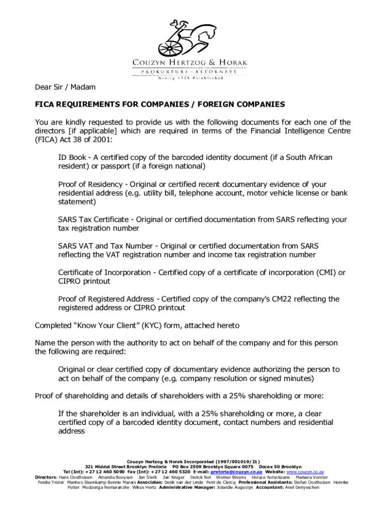 Dear Sir / Madam FICA REQUIREMENTS FOR COMPANIES / FOREIGN COMPANIES You are kindly requested to provide us with the following documents for each one of the directors if applicable which are required