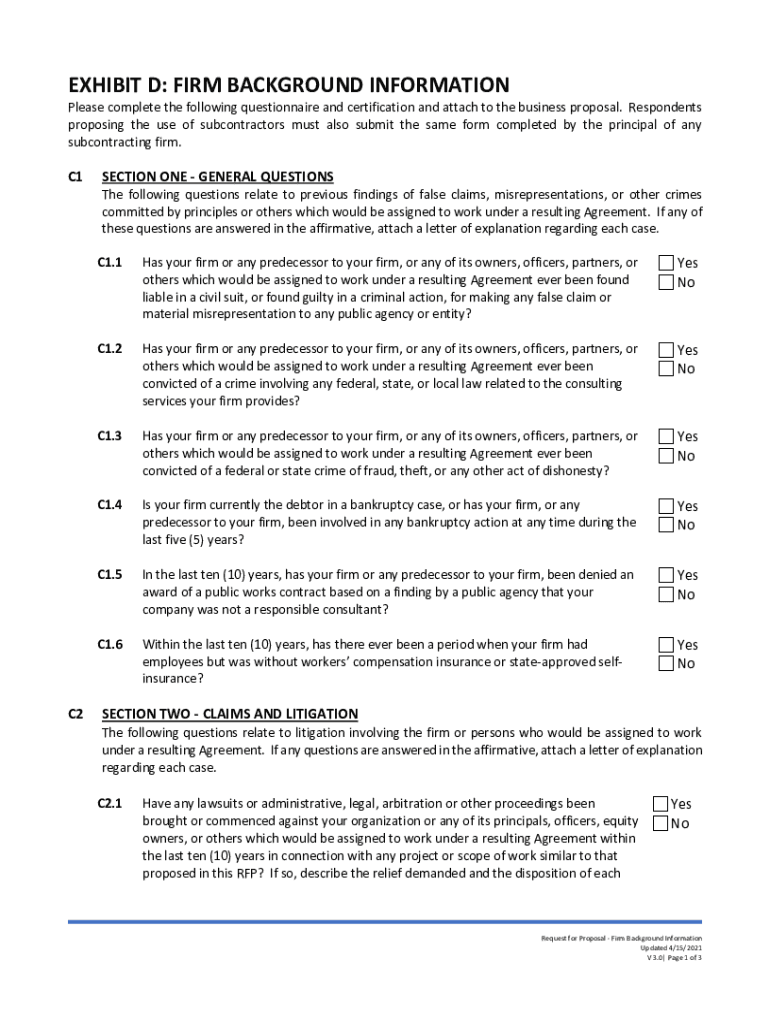 EXHIBIT D: FIRM BACKGROUND INFORMATIONPlease complete the following questionnaire and certification and attach to the business proposal. Respondents proposing the use of subcontractors must also submit