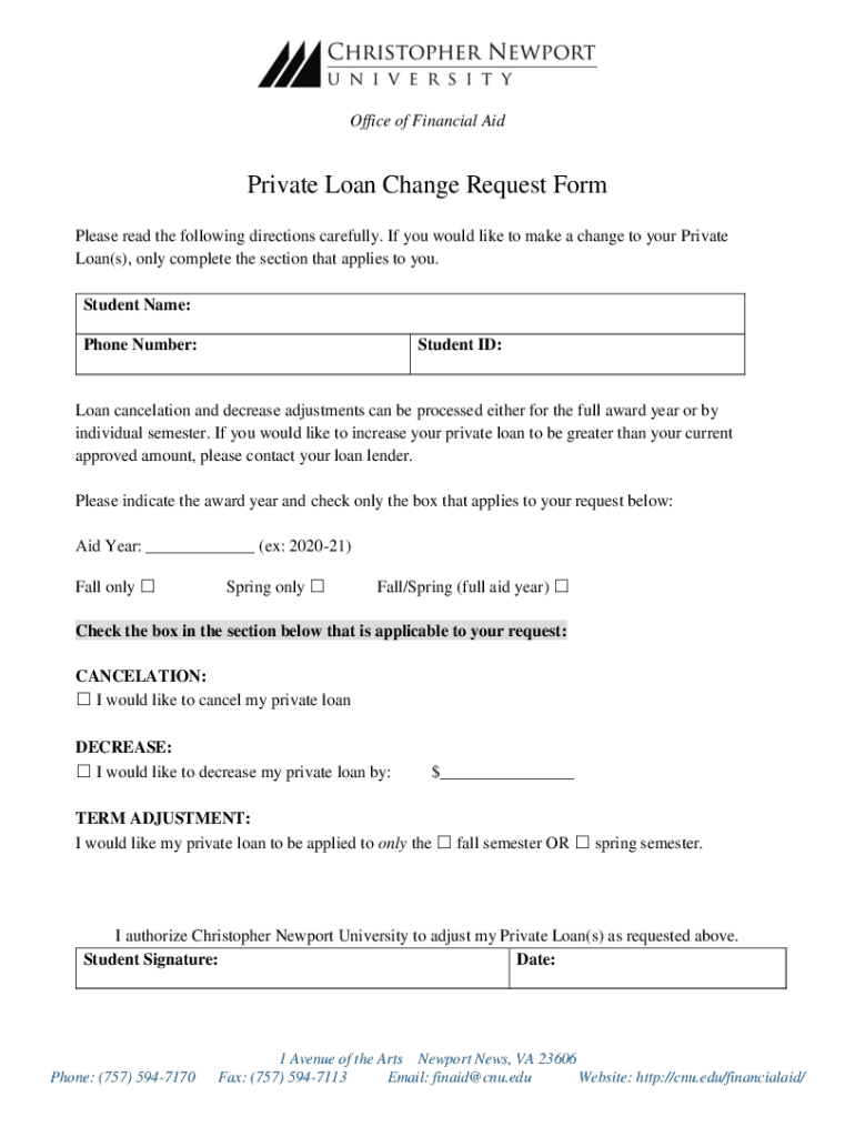 Office of Financial Aid Private Loan Change Request Form Please read the following directions carefully. If you would like to make a change to your Private Loan(s), only complete the section that