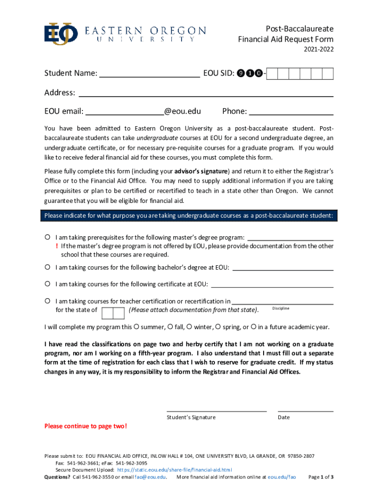 PostBaccalaureate Financial Aid Request Form 20212022Student Name:YOU SID: Address: YOU email:you.earphone:You have been admitted to Eastern Oregon University as a postbaccalaureate student. Postbaccalaureate