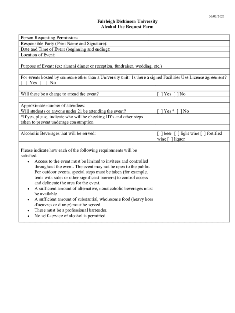 Farmland Dickinson University Alcohol Use Request Form06/03/2021Person Requesting Permission: Responsible Party (Print Name and Signature): Date and Time of Event (beginning and ending): Location