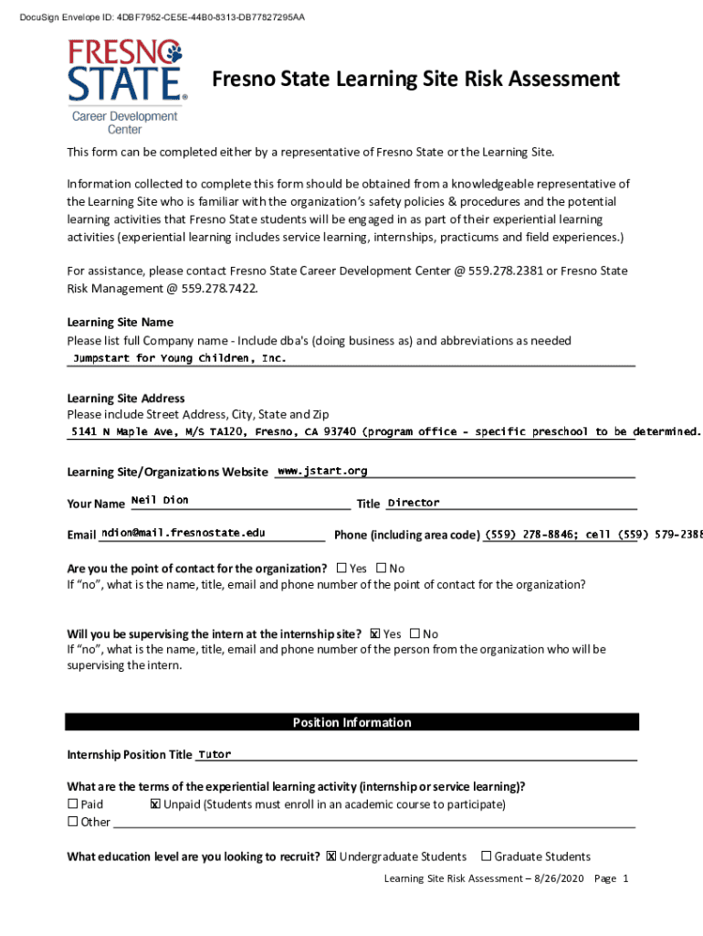 DocuSign Envelope ID: 4DBF7952CE5E44B08313DB77827295AAFresno State Learning Site Risk Assessment This form can be completed either by a representative of Fresno State or the Learning Site. Information