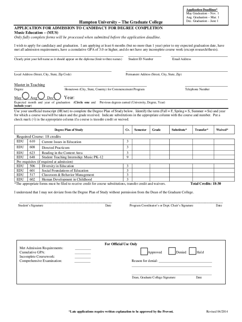 Application Deadlines* May Graduation Nov. 1 Aug. Graduation Mar. 1 Dec. Graduation June 1Hampton University The Graduate College APPLICATION FOR ADMISSION TO CANDIDACY FOR DEGREE COMPLETION Music