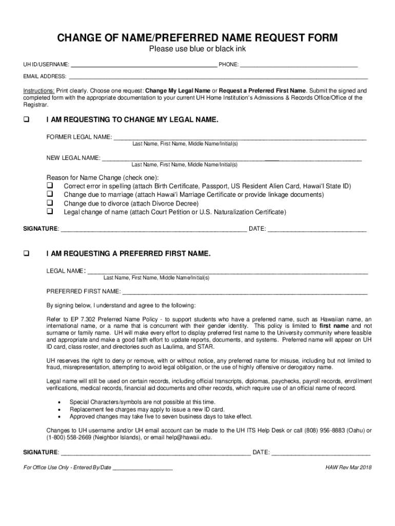 CHANGE OF NAME/PREFERRED NAME REQUEST FORM Please use blue or black ink UH ID/USERNAME: PHONE: EMAIL ADDRESS: Instructions: Print clearly. Choose one request: Change My Legal Name or Request a Preferred