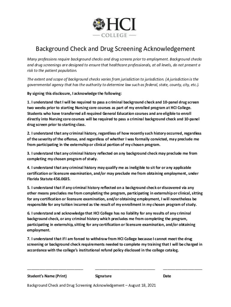 Background Check and Drug Screening Acknowledgement Many professions require background checks and drug screens prior to employment. Background checks and drug screenings are designed to ensure that