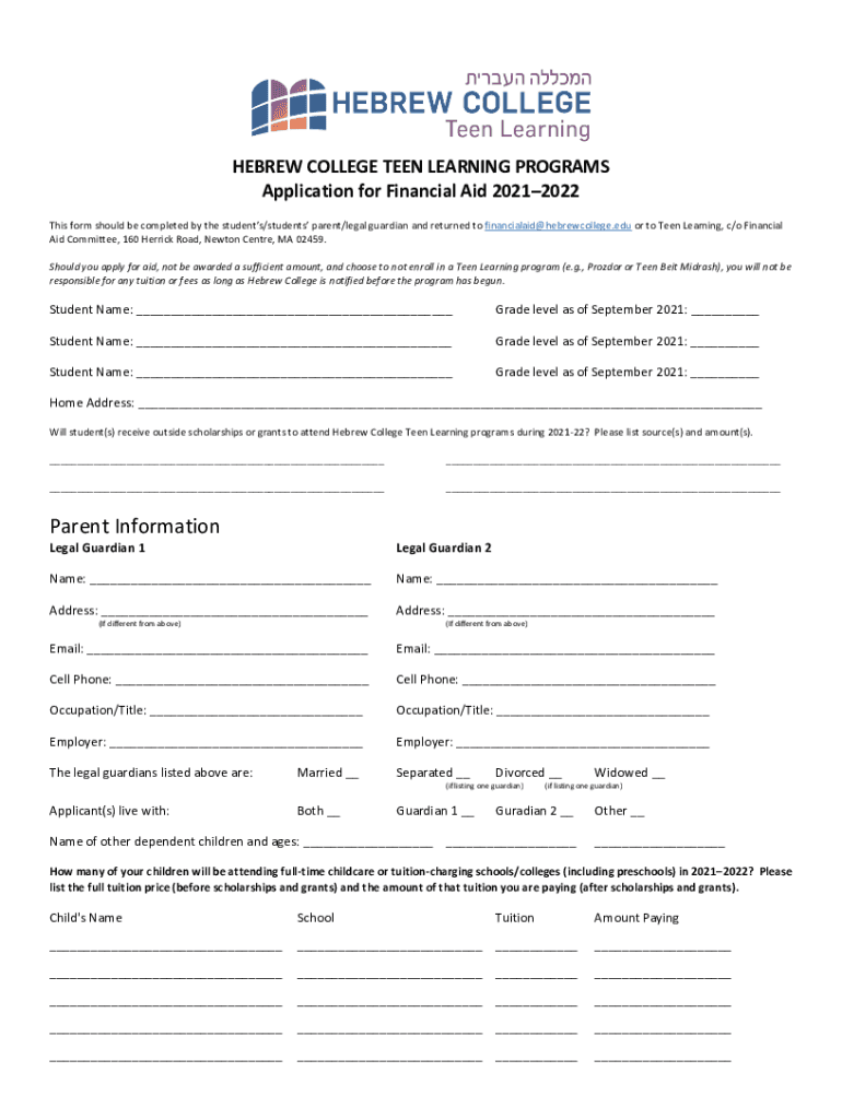HEBREW COLLEGE TEEN LEARNING PROGRAMS Application for Financial Aid 20212022 This form should be completed by the students/students parent/legal guardian and returned to financialaid@hebrewcollege.edu