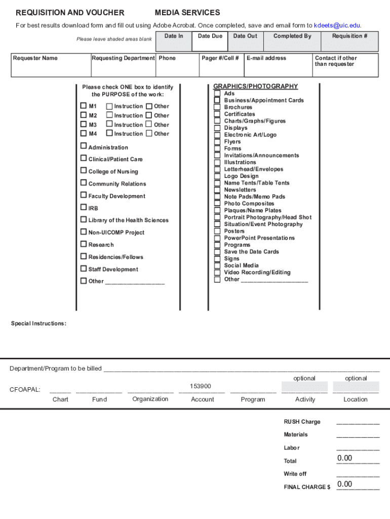 REQUISITION AND VOUCHERMEDIA Services best results download form and fill out using Adobe Acrobat. Once completed, save and email form to meets UIC.edu. Please leave shaded areas blankRequester Name