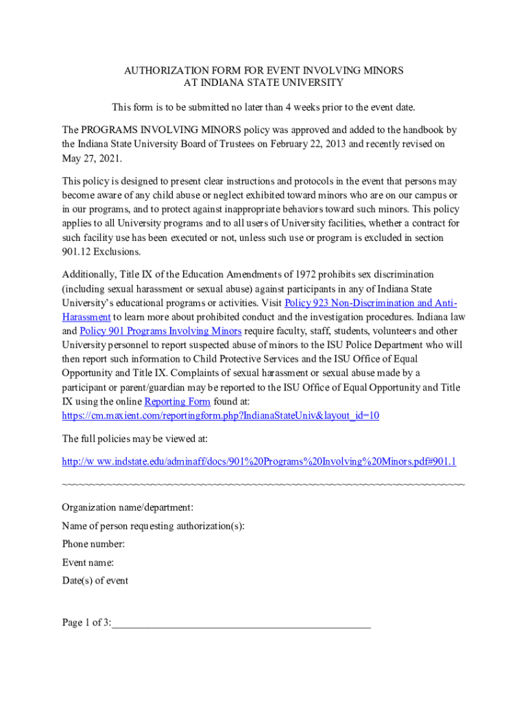 AUTHORIZATION FORM FOR EVENT INVOLVING MINORS AT INDIANA STATE UNIVERSITY This form is to be submitted no later than 4 weeks prior to the event date. The PROGRAMS INVOLVING MINORS policy was approved