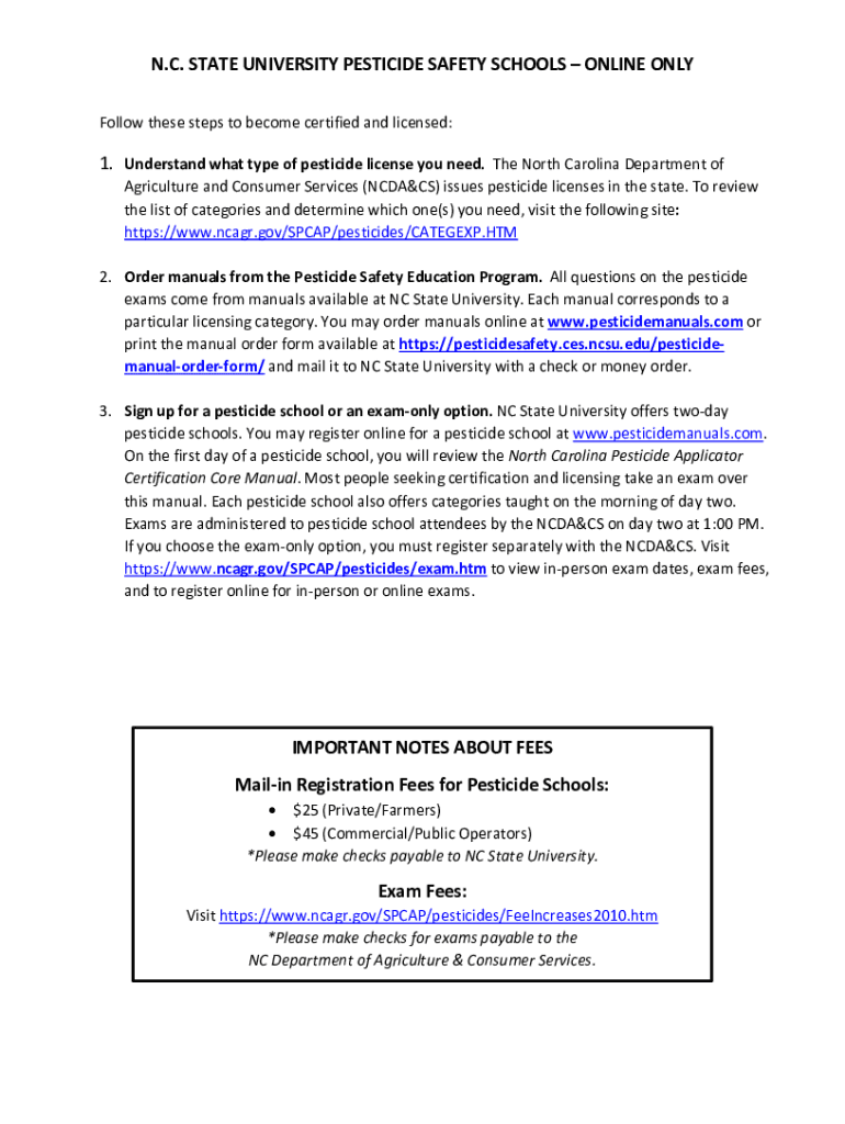 N.C.STATEUNIVERSITYPESTICIDESAFETYSCHOOLSONLINEONLY Followthesestepstobecomecertifiedandlicensed:1. Understandwhattypeofpesticidelicenseyouneed. TheNorthCarolinaDepartmentof AgricultureandConsumerServices(CDAC)issuespesticidelicensesinthestate.