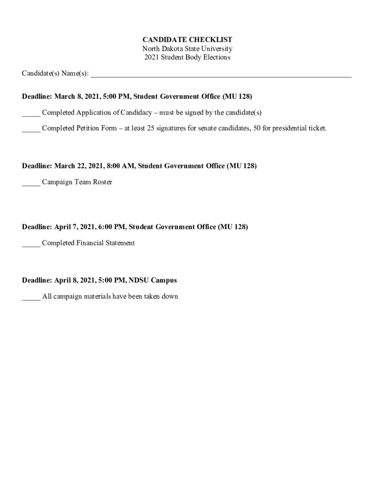 NORTH DAKOTA STATE UNIVERSITY 2021 STUDENT BODY ELECTION CODE Created by the Student Court in accordance with the Constitution of the Student BodyAPPENDIX PLEASE SUBMIT ALL APPLICABLE ITEMS TO: jamison.feske@ndsu.edu