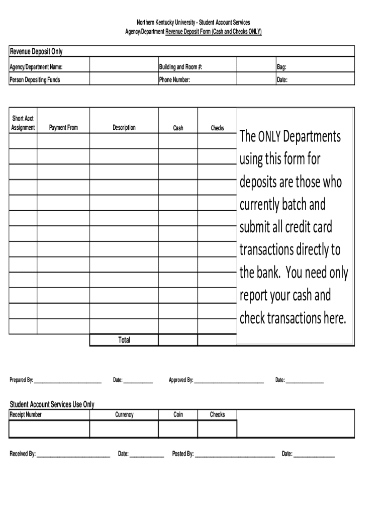 Northern Kentucky University Student Account Services Agency/Department Revenue Deposit Form (Cash and Checks ONLY)Revenue Deposit Only Agency/Department Name:Building and Room #:Bag:Person Depositing