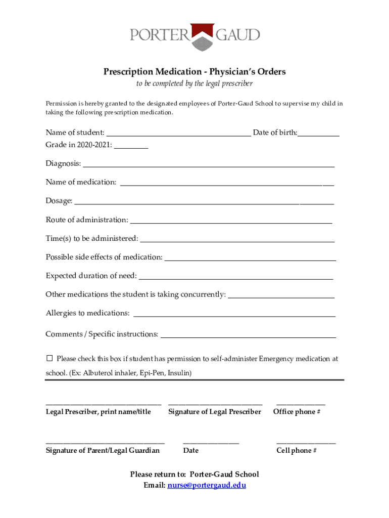 Prescription Medication Physicians Orders to be completed by the legal prescriber Permission is hereby granted to the designated employees of Poltergeist School to supervise my child in taking the