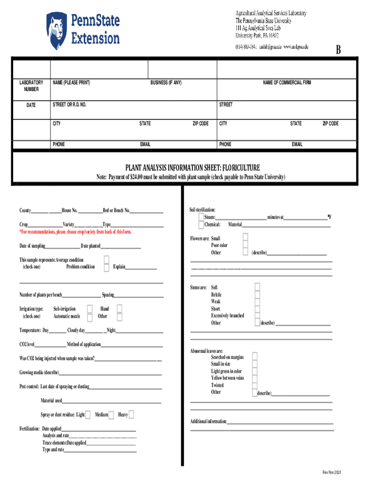 B LABORATORY CUMBERSOME (PLEASE PRINT)BUSINESS (IF ANY)NAME OF COMMERCIAL FIRESCREEN OR R.D. NO.DATESTREETCITYSTATEPHONEEMAILZIP CODECITYPHONESTATEZIP CODEEMAILPLANT ANALYSIS INFORMATION SHEET: AGRICULTURE