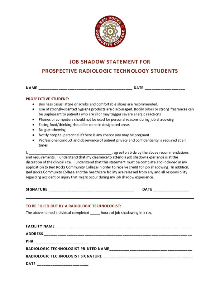 JOB SHADOW STATEMENT FOR PROSPECTIVE RADIOLOGIC TECHNOLOGY STUDENTS NAME DATE PROSPECTIVE STUDENT: Business casual attire or scrubs and comfortable shoes are recommended. Use of strongly scented hygiene