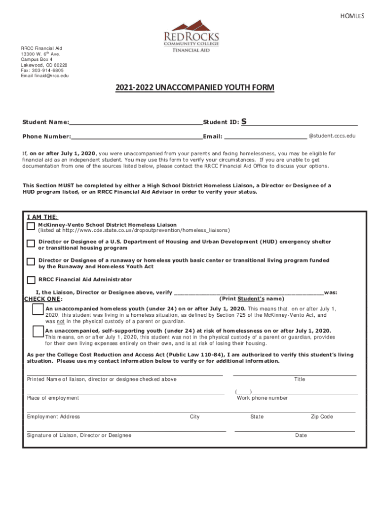 HOMLESRRCC Financial Aid 13300 W. 6th Ave. Campus Box 4 Lakewood, CO 80228 Fax: 3039146805 Email finaid@rrcc.edu2021202 UNACCOMPANIED YOUTH FORMStudent Name:Student ID:Phone Number:Email's #VWXGHQWFFFVHGXIf,