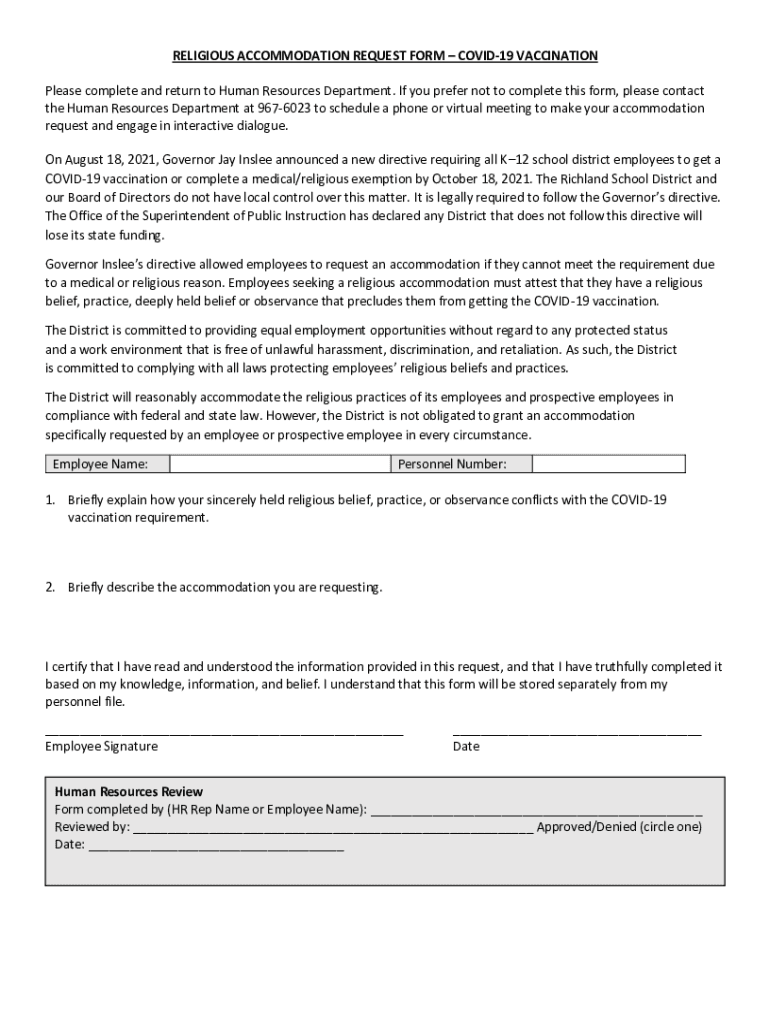 RELIGIOUS ACCOMMODATION REQUEST FORM COVID-19 VACCINATION Please complete and return to Human Resources Department. If you prefer not to complete this form, please contact the Human Resources Department