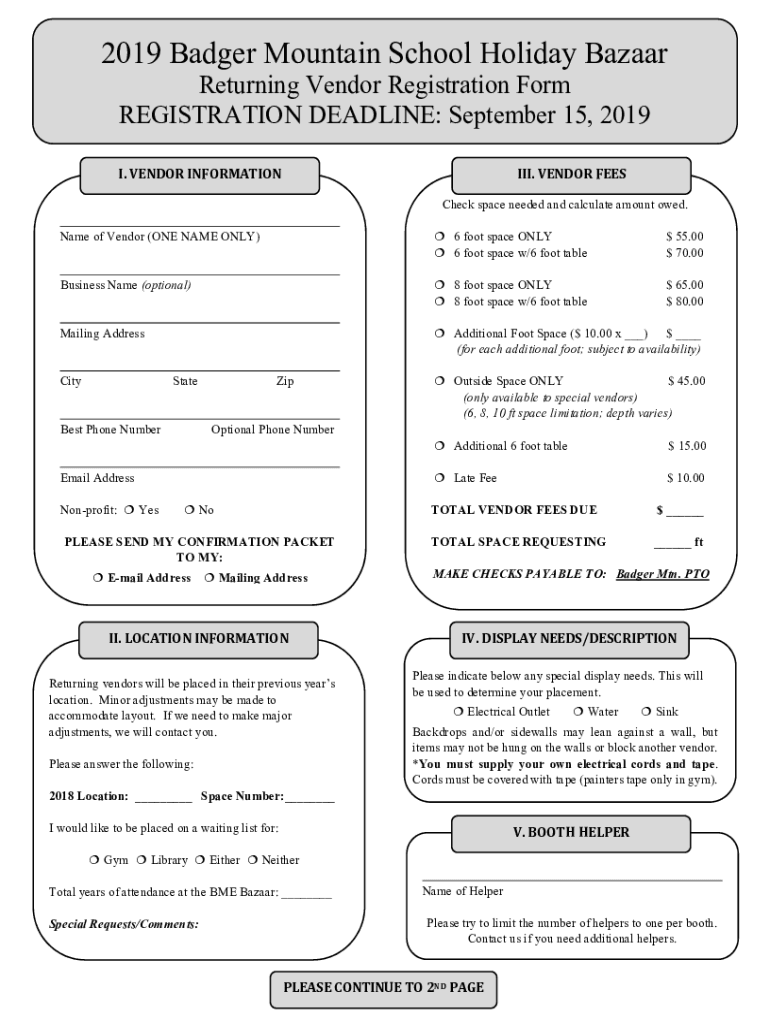 2019 Badger Mountain School Holiday Bazaar Returning Vendor Registration Form REGISTRATION DEADLINE: September 15, 2019, III. VENDOR FEES. VENDOR INFORMATIONCheck space needed and calculate amount